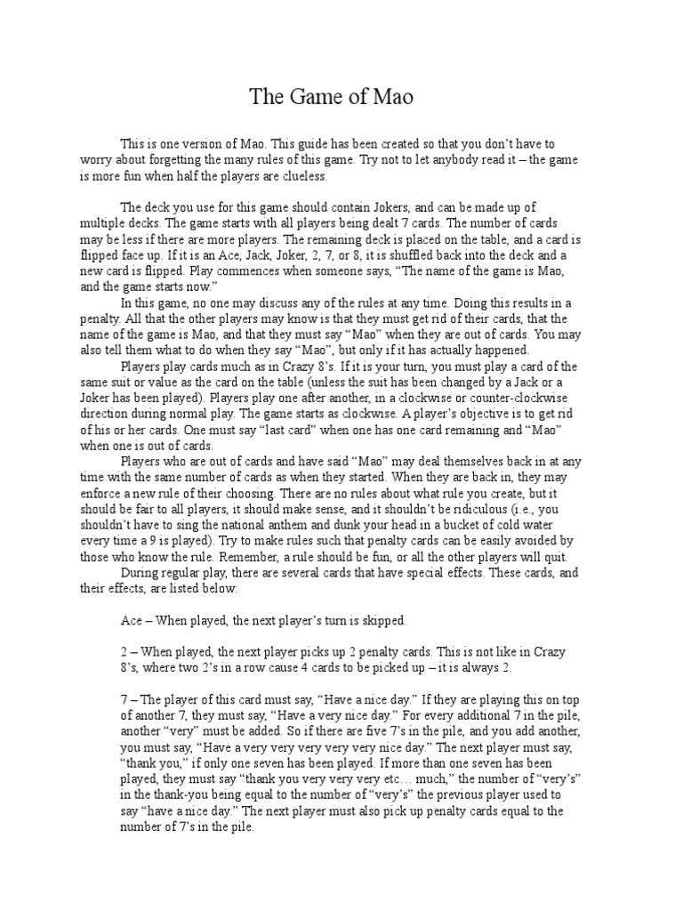 Extra Rules all optional Point of Order. Keep in mind that the rules of Mao differ between. Speaking Rules No Talking This mean unnecessary talks are not allowed in most variants of this game.
